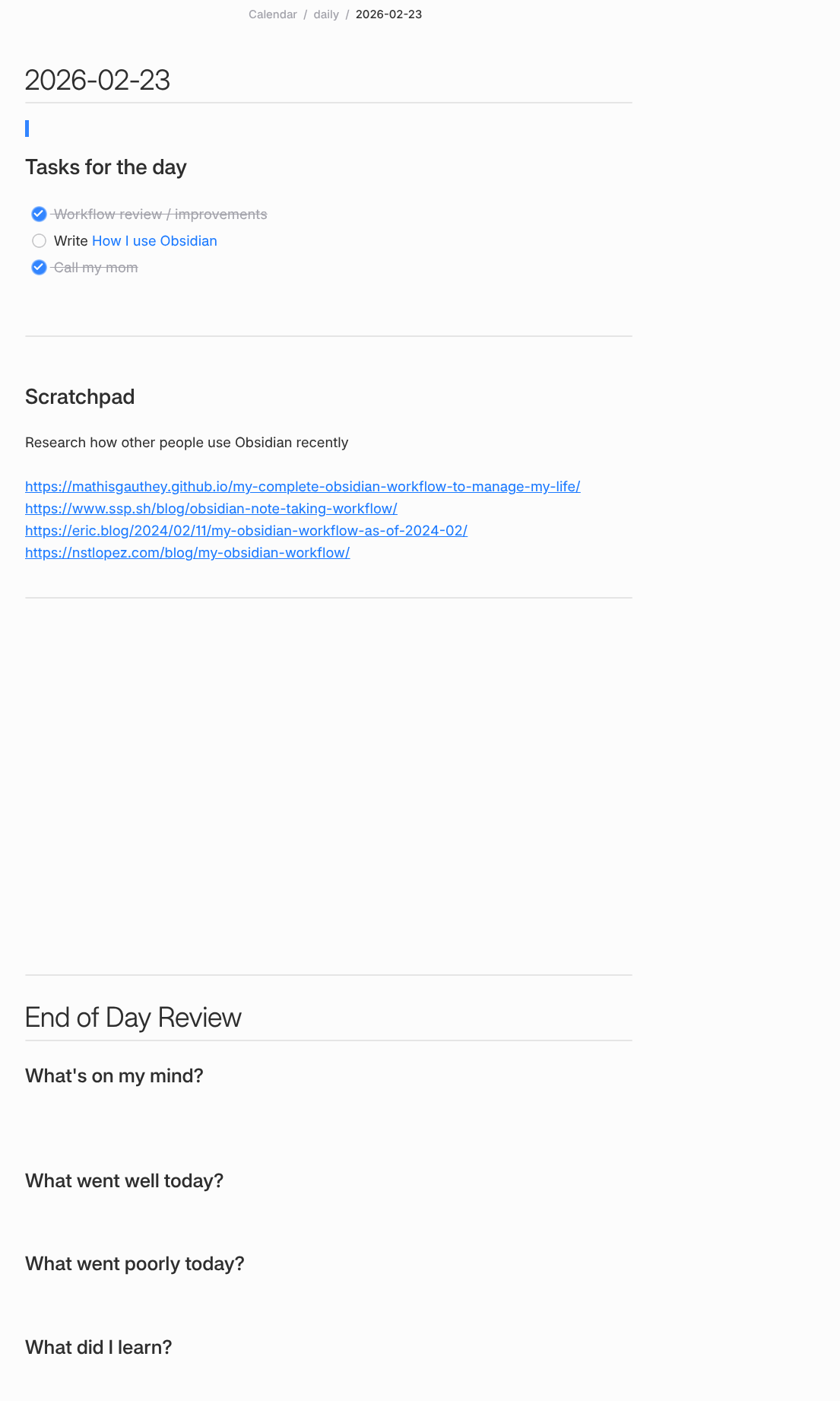 The core of my workflow is a daily note with 3 sections